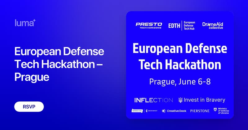 From June 6–8, we’re hosting the European Defense Tech Hackathon in Prague, Czech Republic, together with Presto Ventures | Prest Tech Horizons, Inflection.xyz, DroneAid Collective, Invest in Bravery, Inflection.xyz, and strong support from our partners Dignitas, the Ukrainian Ministry of Defence, Defence Hub by CzechInvest, Creative Dock, and Pierstone.